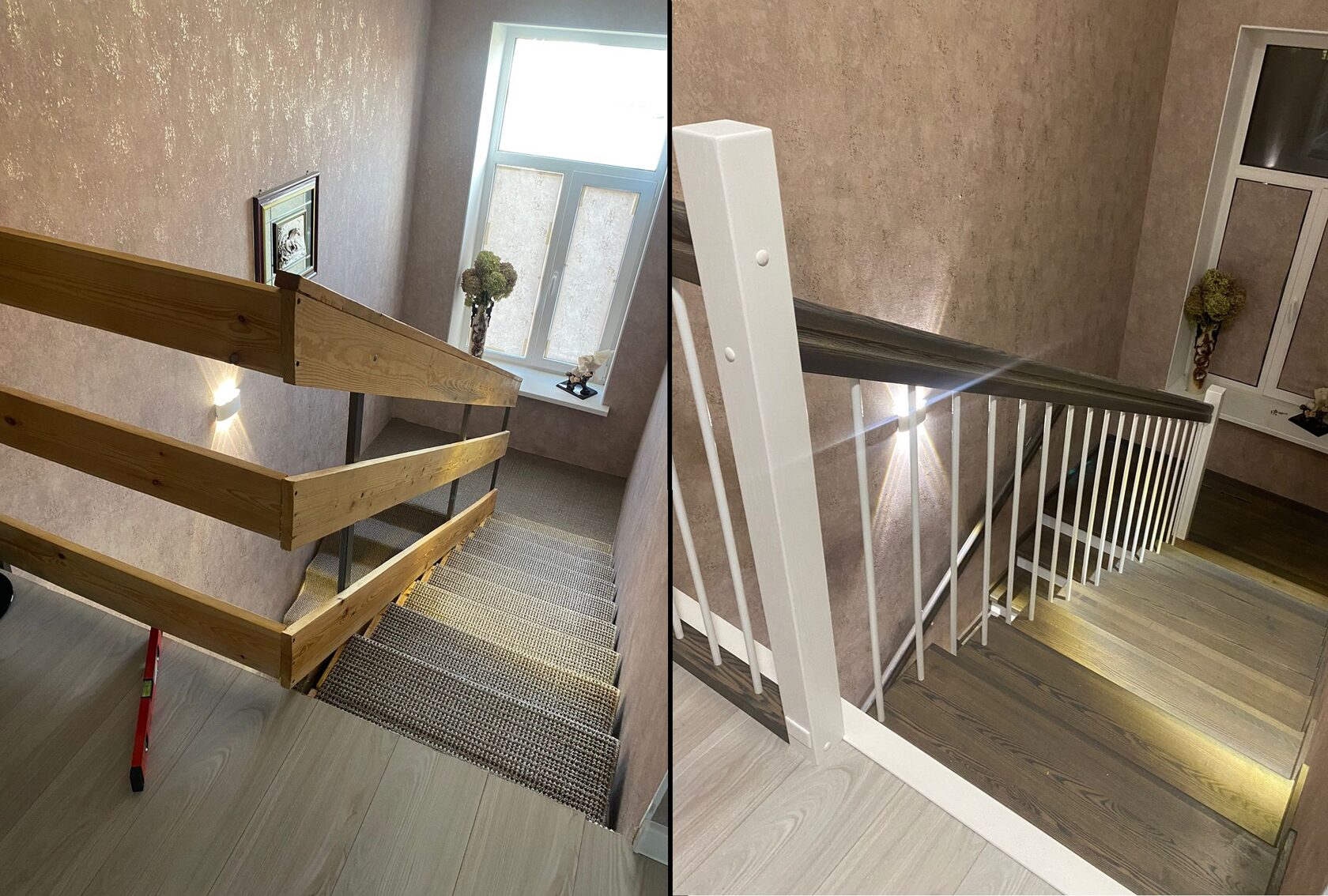 П-образная деревянная лестница с площадкой на металлическом основании.