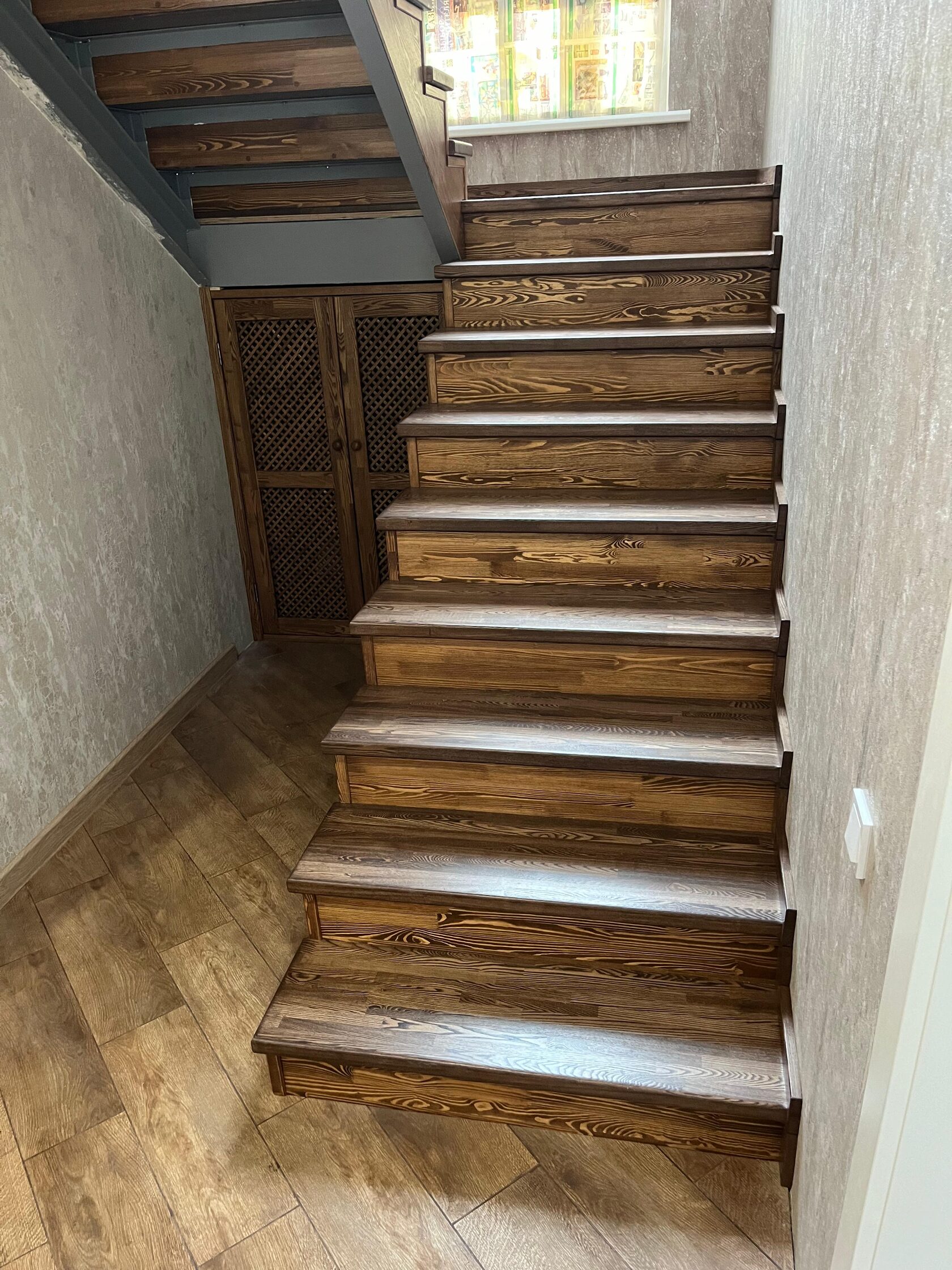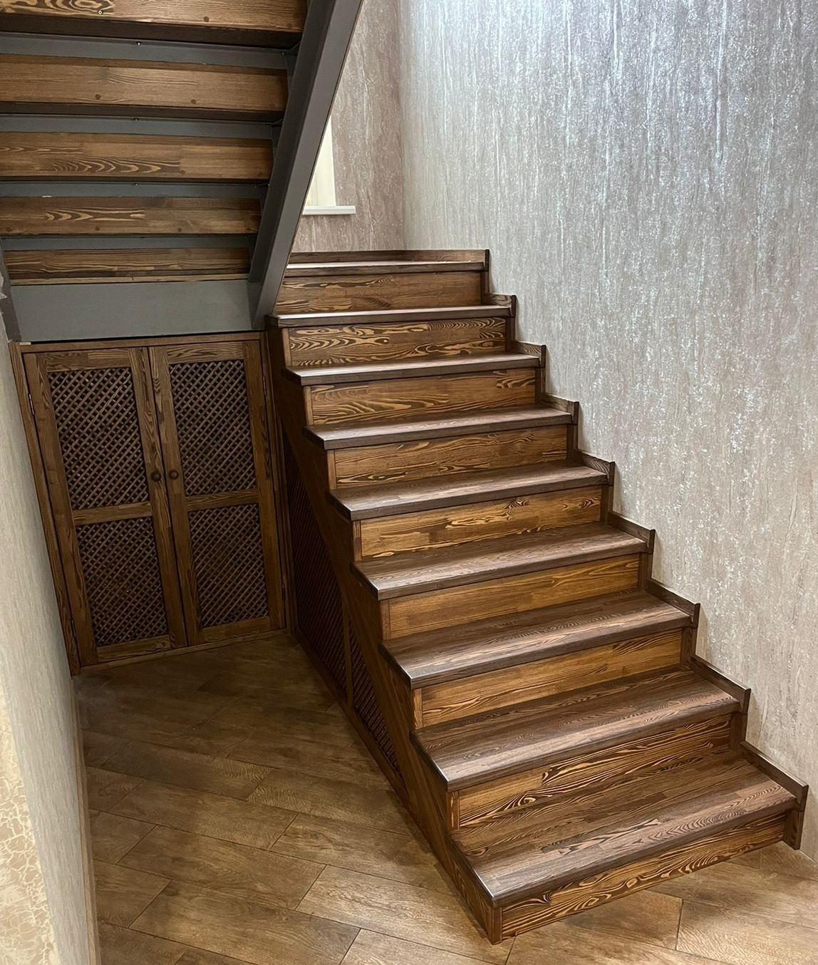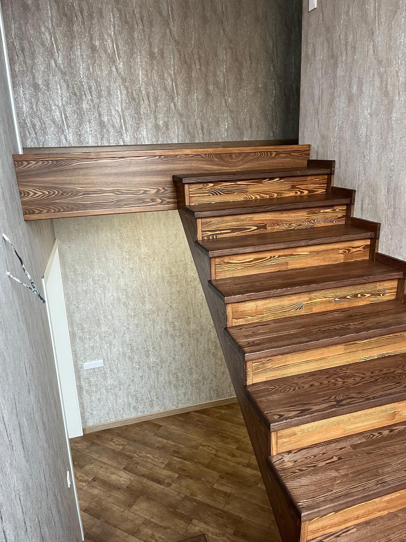 Лестница на Металическом основани. Ступени,обклад - Ясень сращенный; все остальное - Сосна сращенная