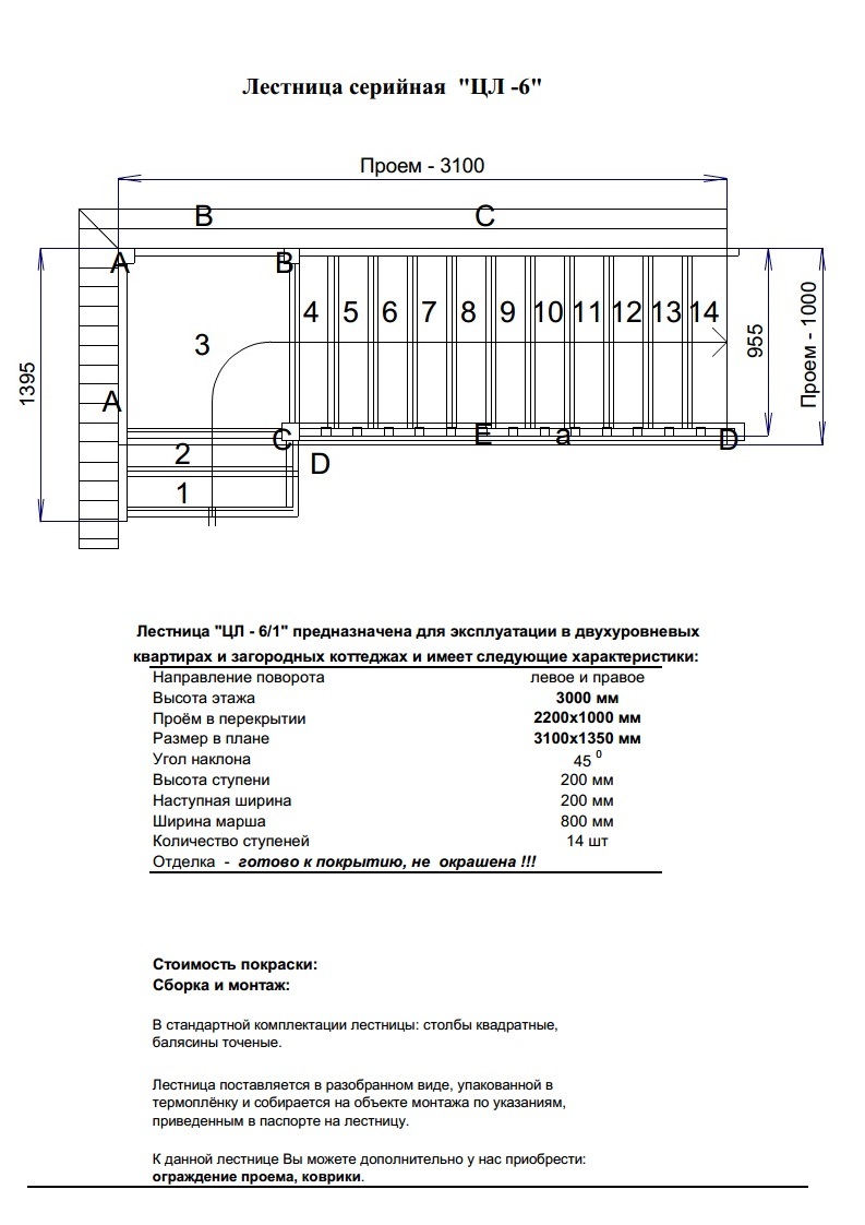 Лестница поставляется в разобранном виде, упакованной в термоплёнку и собирается на объекте монтажа по указаниям, приведенным в паспорте на лестницу.