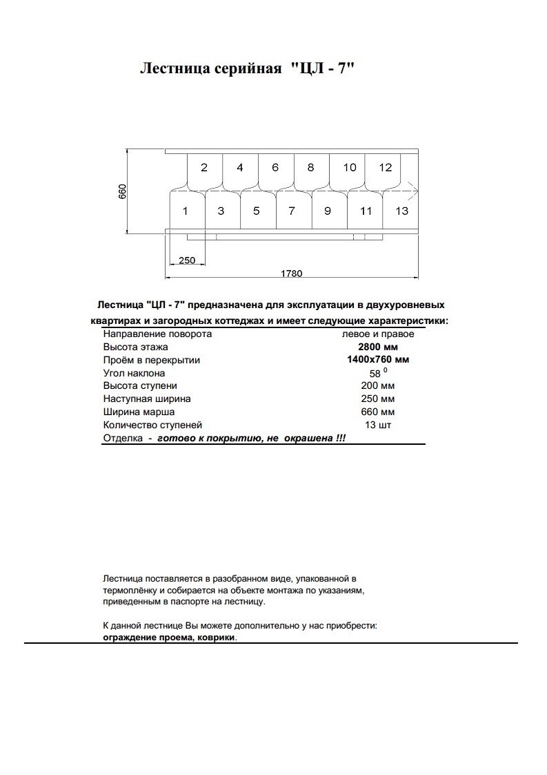 Лестница поставляется в разобранном виде, упакованной в термоплёнку и собирается на объекте монтажа по указаниям, приведенным в паспорте на лестницу.